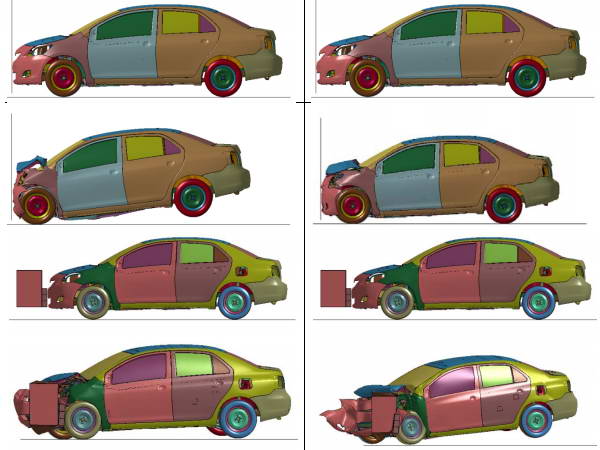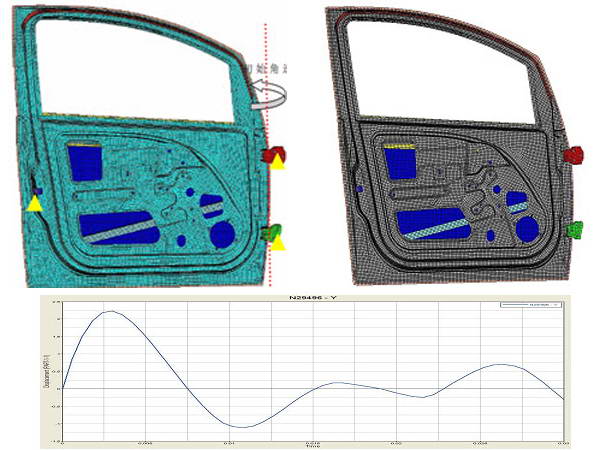 工业机械及重型装备, 汽车及交通运输, 生物医疗和制药, 电子和半导体, 能源及公共事业 汽车行业 Automotive 2023年1月31日 / No Comments 激烈竞争的汽车市场对汽车的开发周期和质量性能提出了很高的要求,CAE的作用就在于它能驱动精 益设计和快速汽车开发流程,可以大量的节省开发成本,缩短开发周期。在结构设计阶段,碰撞安全分 析可以完全控制新车的安全风险。一个全新的车型开发,不做CAE分析,风险会十分巨大。在初期概念设 计阶段,通过CFD计算可以方便地评估新车风阻系数等指标,而不用去做风洞试验,可以节省很多时间和 费用。 弗艾科技的CAE咨询能提供汽车工业行业全面的解决方案,包括CFD分析、动力学分析、耐久性分 析及重要零部件的专项分析。 车门冲击瞬态分析 基于动力学和有限元方法,应用ABAQUS 进行车门冲击瞬态分析。通过对车门施加初始速度,考察车门响应,可以 得到节点位移、单元力和应力等信息。为后续的疲劳分析提供输入数据。 汽车碰撞分析 汽车碰撞试验分为:100%前向56公里每小时速度碰撞,40%偏置63公里每小时速度碰撞,加速度峰值在35G,进行汽车 在行驶过程中的两车碰撞的过程模拟,来验证车辆的强度和人体伤害。