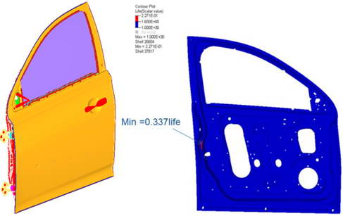 工业机械及重型装备, 汽车及交通运输, 生物医疗和制药, 电子和半导体, 能源及公共事业, 航空航天及国防 耐久与疲劳 Fatigue & Durability 2023年1月31日 / No Comments “在一处或几处产生永久性累积损伤”经一定循环次数后产生裂纹或突然发生完全断裂的过程。 疲劳寿命的定义为发生疲劳破坏时的载荷循环次数,或从开始受载到发生断裂所经过的时间。即材料或构件疲劳失效时所经受的规定 应力或应变的循环次数,是设计人员和工程技术人员十分关注的课题,也是与广大用户切身相关的问题。 车身疲劳分析 在车身结构疲劳领域的国内研究中,在建立了车辆驾驶室疲劳强度计算的力学和数学模型基础上,提出了车辆驾驶室疲 劳强度研究方法。在分析的基础上采用结构优化设计的方法优化结构、合理选择材料等,提高白车身结构的静态力学性能 与动态疲劳寿命。 侧门关门耐久性能分析 关门耐久性能是汽车侧门的重要评估工况之一。目前汽车厂多采用仿真结合试验来确保侧门的耐久性,为了减少试验成 本,缩短研发周期,需要准确、简单、快速的仿真分析预测方法。该分析方法能快速有效地再现侧门关门耐久性能,有利 于在产品开发前期预测及优化车门结构性能,提高设计效率。 喇叭支架系统振动疲劳分析 喇叭支架系统在振动试验中发生疲劳断裂失效。针对试验结果分析,采用HyperWorks软件对现有的喇叭支架进行了模态 和动应力、振动加速度计算分析,确定了仿真分析的边界条件、共振阻尼参数以及共振疲劳分析的方法,提出了结构改进 方案,并且该方案通过了试验验证。