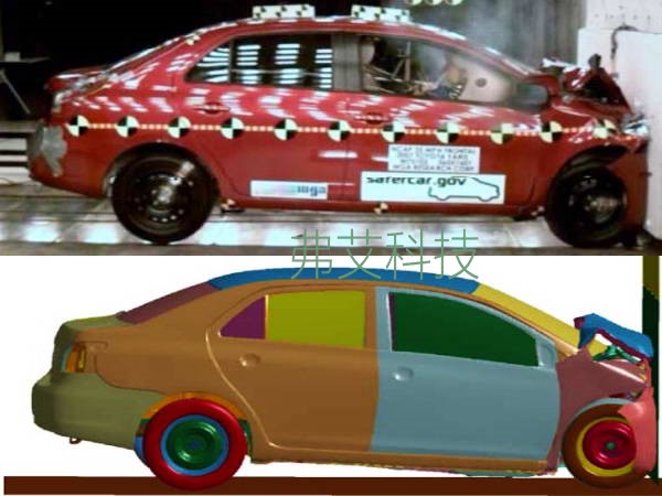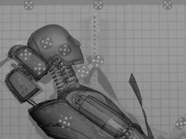 运用混三50%TH的假人进行座椅的鞭打实验,首先确认HP点的坐标吻合,量测头部和座椅头枕的水平位移,把座椅 调整到中间位置,以每小时15.6公里速度进行碰撞,加速度峰值到达10G.